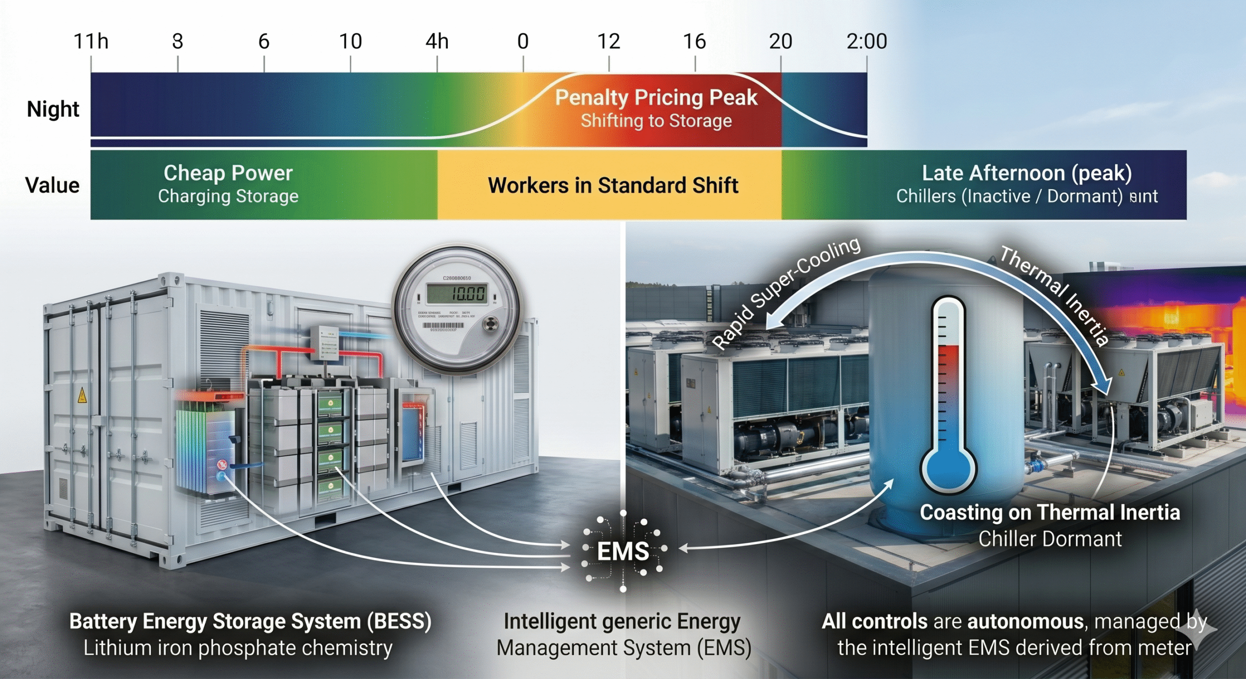 | Can tolerate 2 to 4 hours of shutdown (relying on thermal inertia) | Pure Load Shifting | Automated control relays and scheduling software |